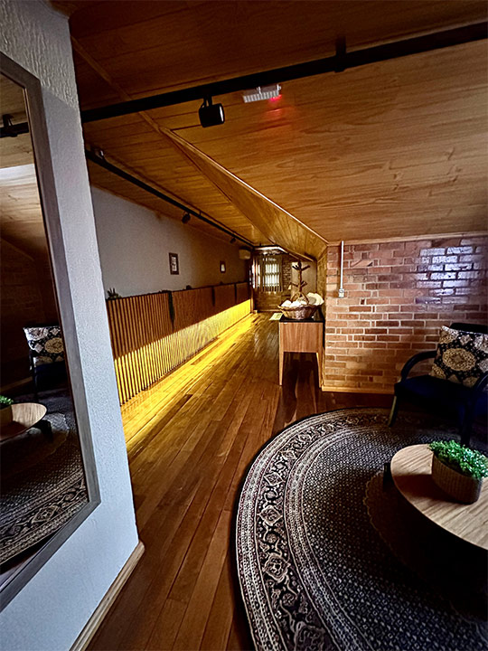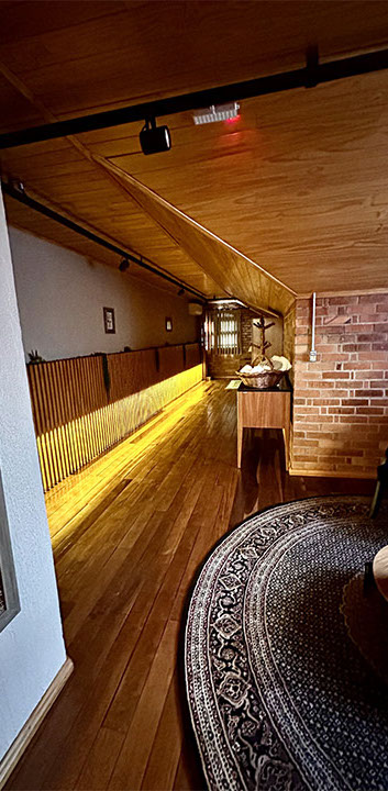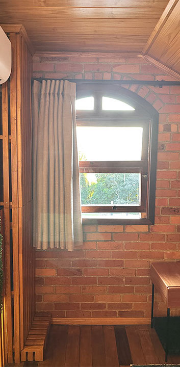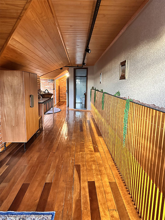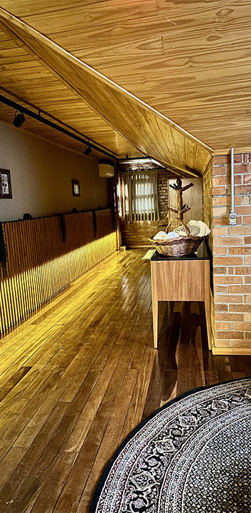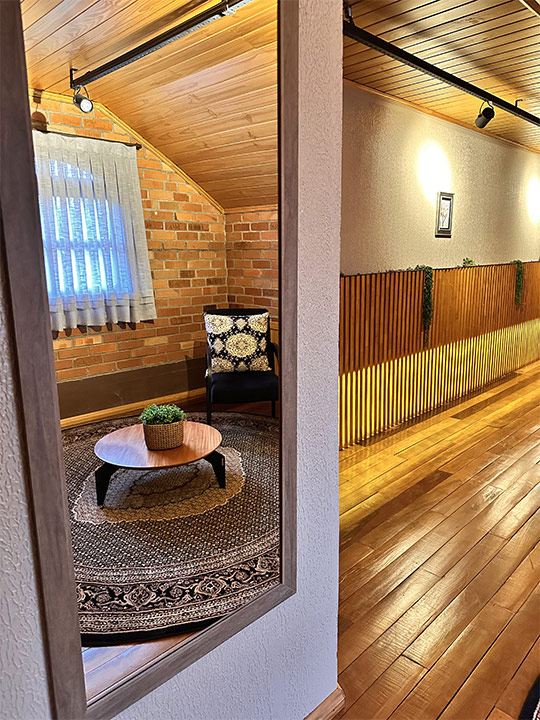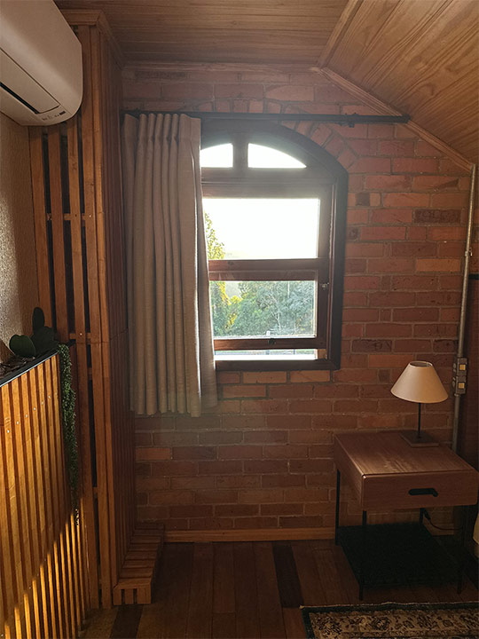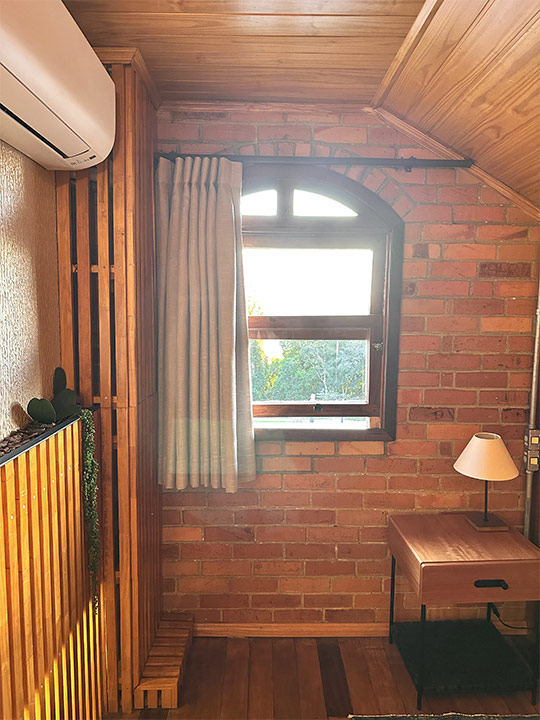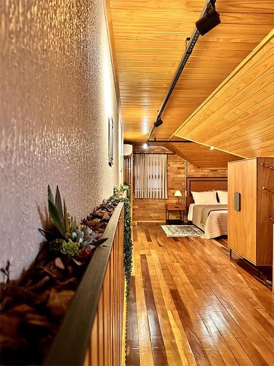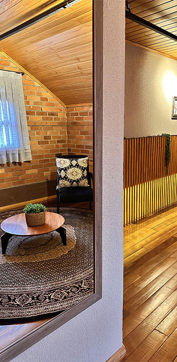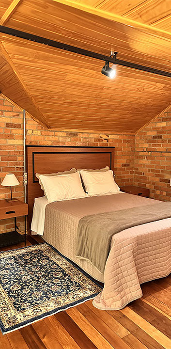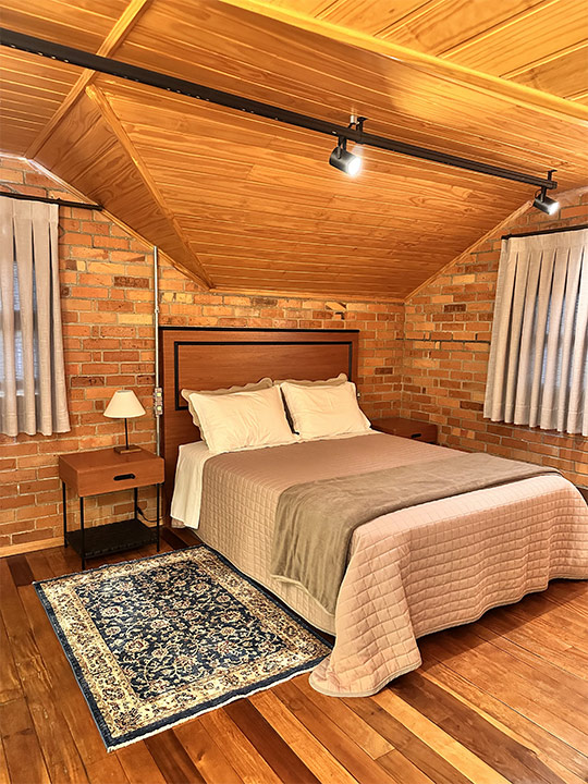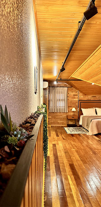Aconchegante é palavra que representa a suíte Lino na Pousada Rugero. Descubra esta suíte com um visual moderno, teto rebaixado em madeira e vista privilegiada para as paisagens locais.